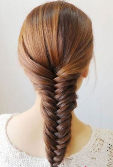 编到发尾,用皮筋将系上结,一条鱼骨辫算是完成了。