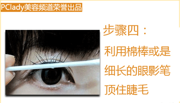 步骤四:最重要的步骤就在这个步骤,每刷完一遍的睫毛就赶紧利用棉棒或是细长的眼影笔顶住睫毛,尽量从接近睫毛根部的位置往后方的眼皮位置顶住,利用睫毛膏未干前的可塑型使睫毛站起来,但是这步骤要特别小心,不能真的碰到眼皮,否则还没干的睫毛膏也会沾粘上去,没有信心的人建议可以利用小纸条垫在眼皮前方。无论你要刷几次睫毛膏,只要每次刷完就做这个动作,保证你的睫毛都能根根飞上天啊!