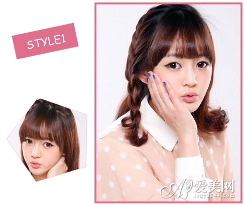 style1:甜美侧边发辫 空气感刘海清新唯美,侧边编发效果为你增添妩媚俏皮指数,发尾自然卷翘,可爱减龄。 扎发步骤: