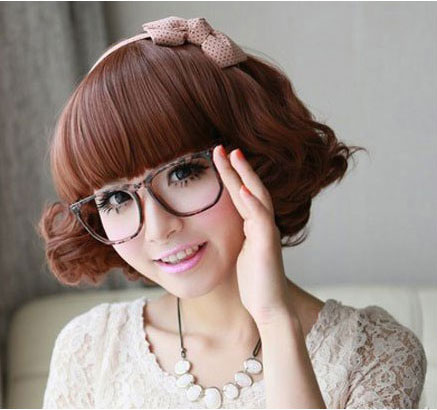 蜜糖棕的发色非常甜蜜哦,超级可爱的短卷发,从秀发的中部开始打造出卷曲的形状,搭配一副眼镜,丝毫不会觉得难看,反而显得更加可爱了呢!扮嫩五极限,再佩戴个波点蝴蝶结发饰,这是从哪儿冒出来的小姑娘?